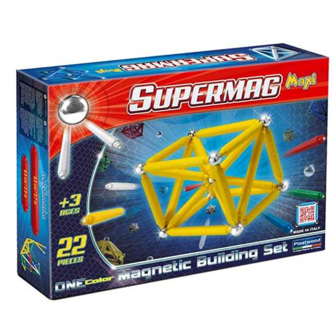 Supermag MAXI one color 22 bucati Contine 22 de elemente magneti de inalta calitate cu ajutorul carora se pot forma diverse forme geometrice. Lungimea unui betisor magnetic este de aproximativ 6 cm. Recomandat copiilor cu varsta peste trei ani.