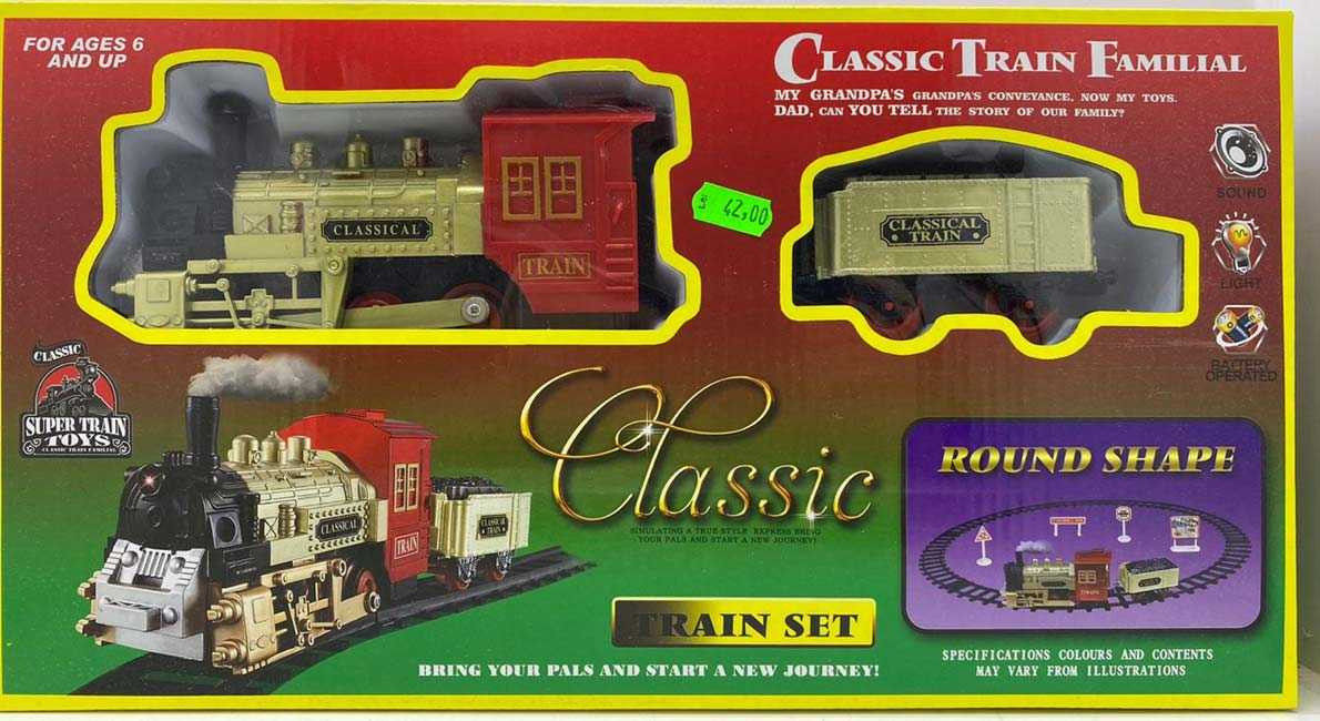 Tren Classical cu sina are sunet si lumini. Contine o locomotiva clasica si un vagon precum si piese pentru construirea sinei .Functioneaza cu 2 baterii de 1.5V AA care nu sunt incluse.. Este recomandat copiilor peste 6 ani.