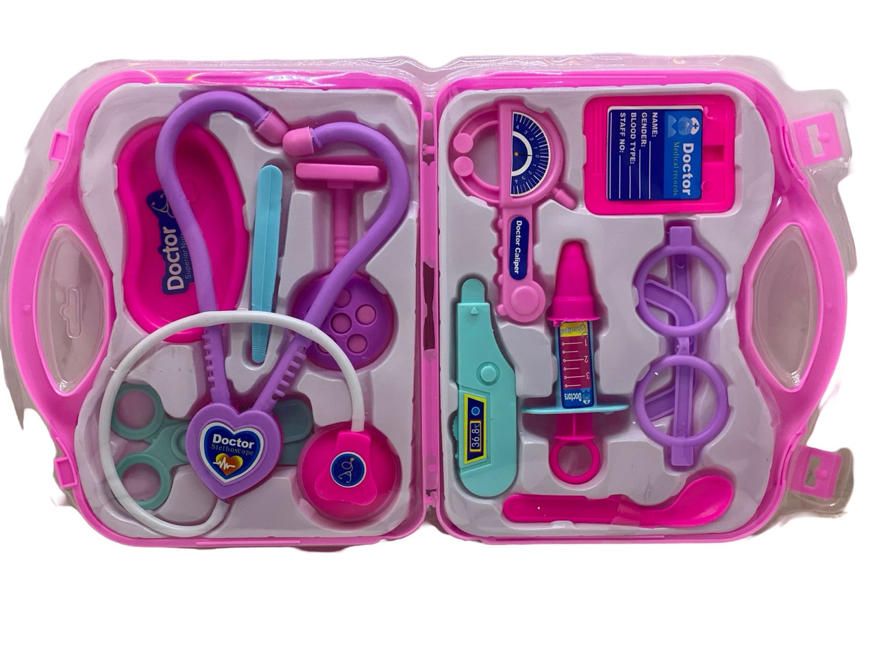 Trusa de doctor valiza. Aceasta trusa de doctor copii ofera ore intregi de distractie si invatare. Copiii dezvolta si invata notiuni de baza despre echipamentul medical si despre medicina. Accesoriilor medicale pot fi depozitate in valiza pentru doctori, astfel nu se pierde nicio jucarie. Setul include 13 piese foarfeca, seringa, ochelari, ciocanel . Este recomandat copiilor peste 3 ani.