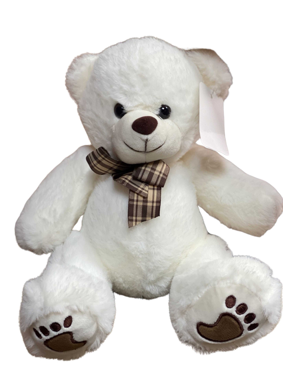 Urs alb pufos de plus cu fundita in carouri si labute. Are inaltimea de 28 cm si umplutura puf siliconat.