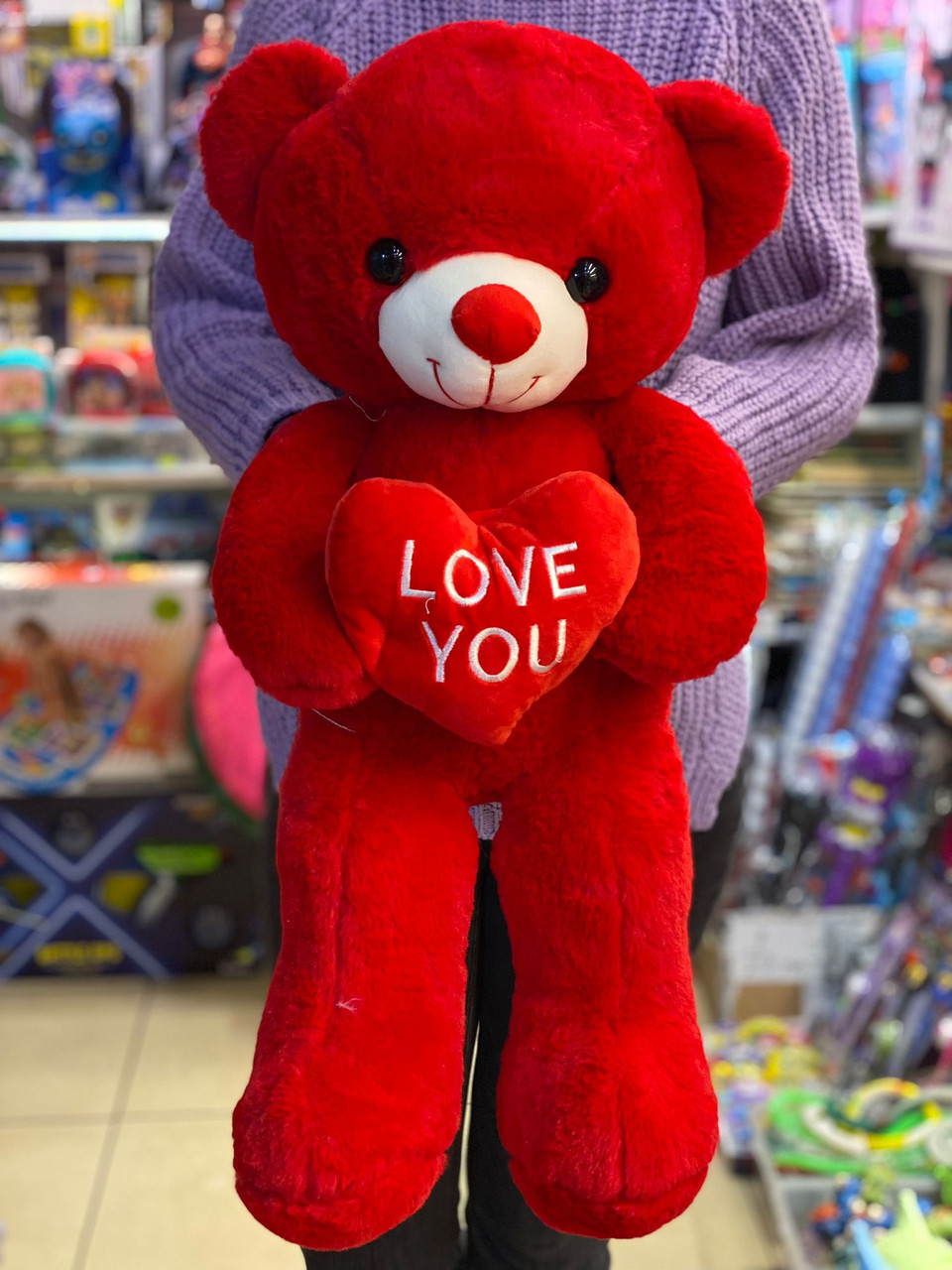 Urs de plus Rosu love you cu imprimeu atat pe inima din piept cat si pe fiecare picior. Are inaltimea de 60cm .Umplutura este puf siliconat antialergic. Se curăță prin spălare sau ștergere cu o cârpă umedă. Este recomandat pentru copii cu vârsta peste trei ani