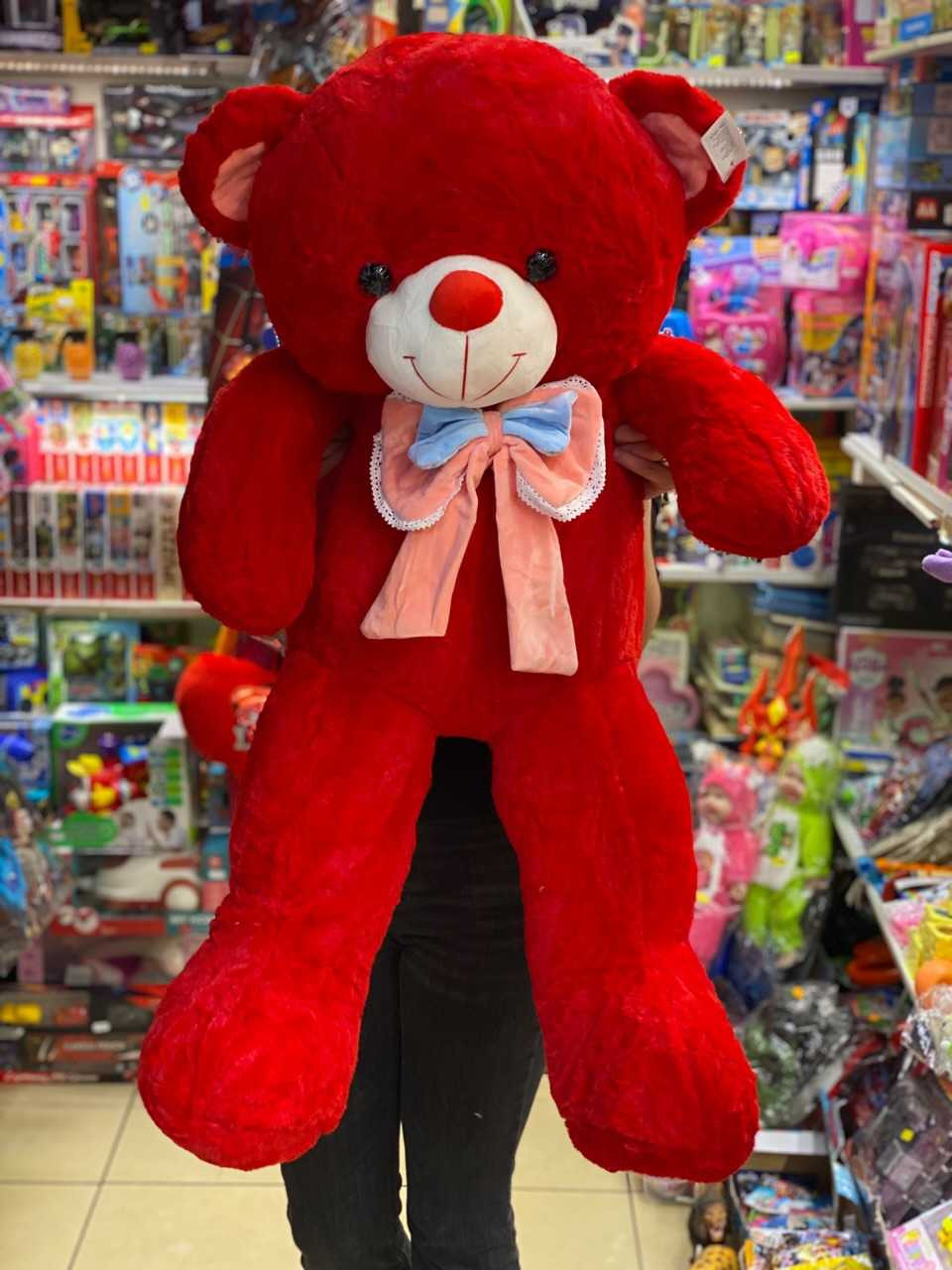 Ursulet din plus rosu de plus cu papion 1 m. Ursulet din plus catifelat si moale la atingere. Este umplut cu puf siliconat antialergic. Curatarea se realizeaza cu o carpa umeda sau prin spalare la masina dupa ce in prealabil se scoate umplutura din el. Nu contine materiale toxice.