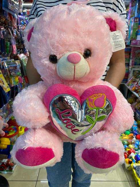 jucarie Ursulet roz cu inimioara 40 centimetri. Recomandat copiilor cu varsta peste trei ani. Se curata prin spalare sau stergere cu o carpa umeda. Greutate 1 kg. Material blanita si interior puf siliconat